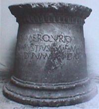 wahrscheinlich aus einem Lararium, 1.Jh.n.Chr. Die Ursprünge des Merkurkultes in Rom reichen in das 5.Jh.v.Chr. zurück. Die Einführung des Kultus fand im Zusammenhang mit der Errichtung des Tempels für Ceres, Liber und Libera statt. Das mercatorum collegium (Berufsvereinigung der Händler) wurde von jenem Mann gegründet, der am 15. Mai 495 v.Chr. den Merkurtempel einweihte. Die amtierenden Consuln stritten sich darüber, wer den Tempel nun einweihen sollte. Daraufhin hatte der Senat das Volk am Comitium entscheiden lassen. Die Wahl fiel auf den Centurio M. Laetorius, der die Weihe vollzog und das Gremium gründete. Neben Merkur schützten auch Minerva und Volcanus das Gremium, das mehrmals umgewandelt noch in der Spätantike eine Rolle spielte. Im Mittelalter übernahmen die Zünfte mit ihren Schutzheiligen eine ähnliche Funktion. Damit hatte der Merkurkult eine militärische Komponente erhalten, die dem griechischen Hermeskult fremd war. Diese Eigenschaft sorgte zusätzlich für die Beliebtheit des Gottes. Bekanntlich entwickelte sich der Handel in den Provinzen zuerst rund um die Legionslager und deren Ableger. Da die Soldaten in die Verwaltung eingebunden waren, konnte sich der Kult noch schneller verbreiten. Die Planungen für den Merkurtempel hatten den Bau einer zweiten Anlage, die Ceres geweiht war, miteingeschlossen. Dieser wurde zwei Jahre später eingeweiht. Die Getreidegöttin und der Tausch- und Handelsgott hatten damit eine gemeinsame Basis. Bei den während Krisenzeiten auf Anraten der sibyllinischen Bücher durchgeführten Götterbewirtungen wurde ihm keine weibliche Gottheit, sondern Neptun, zur Seite gestellt. Hier schlägt die Bedeutung des Seehandels durch. Schon in archaischer Zeit weihten die Kaufleute in Rom den zehnten Teil ihres Gewinnes am Ara Maxima des Hercules den Göttern. Neptun geleitete die Schiffe über seine Elemente und Merkur war der Gott des Warentausches; ihre Verbindung somit offensichtlich. Im Jahre 217 v.Chr. verordneten die sibyllinischen Bücher eine Änderung bei der Götterbewirtung und damit ordnete man Ceres und Merkur zueinander. Für kurze Zeit war war den Münzen aes signatum (Barrengeld) vorangegangen, die u.a. mit dem caduceus geschmückt sein konnten (bei ansonsten recht dürftiger Motivwahl). Meist mit einer vitta (wehendes Band) dargestellt, macht dies den Barren zum Eigentum des Gottes, da in der römischen Religion diese Binde (egal ob an Sache, Tier oder Priester) die enge Verbundenheit zur Gottheit ausdrückt. Damit versehene Gegenstände sind somit sacer (heilig & geweiht). Als man um 280/276 v.Chr. begann Bronzemünzen zu giessen, erschien als erstes Merkur mit geflügeltem Hut als Münzbild. Gut fünfzig Jahre später erschien Ianus auf den Bronzeassen und blieb dort bis in die Kaiserzeit obligat. Doch verschwand Merkur nicht von den Münzen. Er wechselte vielmehr auf den Sextans (= 1/6 As). Die Beliebtheit des Kultes bedeutet eine weite Verbreitung. In Falerii veteres (eine Stadt nördlich von Rom) wurde etwa zu Beginn des 20.Jh. ein mittelrepublikanisches Merkurheiligtum archäologisch erschlossen. Neben Fragmenten diverser Terrakottastatuen fand sich eine grosse Anzahl von Weihegeschenken. In der dortigen faliskischen Sprache hiess der Gott Titos Mercus und besass damit einen Vornamen. Im archaischen Latein wurde Merkur auf Inschriften auch mit MERQVRIVS widergegeben. In der religiösen Kunst der späten Republik und der folgenden Kaiserzeit tauchen solch antiquierte Formen gerne auf. Künstlerisch taucht Merkur am meisten in den Lararien der Privathäuser auf. Aber nicht nur in Form von Statuetten trifft man immer wieder auf den Gott, auch Wandgemälde huldigen ihm. Im Schmuckbereich dominiert er auf Gemmen. Die ihm geweihten Altäre waren oft Rundaltäre. Runde Tempelformen dominieren auch bei Vesta, Diana und Hercules. Viele Merkurstatuetten finden sich in Gesellschaft von Tieren. Es muss nicht ein einzelnes sein, sie können von einem ganzen Zoo umringt sein. Widder oder Ziegenbock (sich gegenseitig ausschliessend) waren am Beliebtesten. Dazu kamen noch Eber und Hahn. Sie alle dienten dem Opfer für den Gott. Mercurius war nicht wählerisch bei den Gaben, die man ihm brachte. Zwei begleitende Tiere, Eidechse und Schildkröte, wurden ihm aber nicht geopfert. Sie entstammen der Mythologie. Aus einem Schildkrötenpanzer hatte das griechische Pendant zu Merkur die Lyra gebastelt. Noch Horaz nennt ihn den "Vater der geschwungenen Lyra". In der Kaiserzeit gab es Darstellungen des Mercurius facundus (= Hermes logios), mit den Portraits der Thronfolger. Dies deshalb, da die erste öffentliche rhetorische Leistung eines Thronfolgers zumeist die Totenrede über einen Verstorbenen Verwandten war. In diesem Sinne breitete sich die Darstellungsform auch auf Privathaushalte aus.
